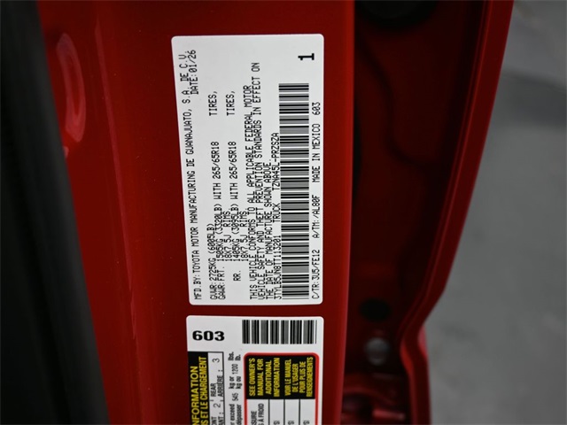 Supersonic Red 2026 Toyota Tacoma TRD Sport 4WD 8-Speed Automatic 2.4L 4-Cylinder apple car play, android, vehicle protection premium package, charging and connectivity kit, exhaust tip - black chrome, ball mount, tailgate insert - black, predator step*, spray-on bed liner, bed step**, ABS brakes, Alloy wheels, Electronic Stability Control, Heated door mirrors, Illuminated entry, Low tire pressure warning, Remote keyless entry, Traction control, TRD Sport Package. Doggett Toyota of Beaumont is proud to present you with another True Market Priced Pre-Owned Vehicle. This 2026 Toyota Tacoma TRD Sport is loaded with the following Factory Options: TRD Sport Package, ABS brakes, Alloy wheels, Electronic Stability Control, Heated door mirrors, Illuminated entry, Low tire pressure warning, Remote keyless entry, and Traction control TRD Sport Package, ABS brakes, Alloy wheels, Electronic Stability Control, Heated door mirrors, Illuminated entry, Low tire pressure warning, Remote keyless entry, Traction control, 3.583 Axle Ratio, 4-Wheel Disc Brakes, 6 Speakers, Air Conditioning, AM/FM radio: SiriusXM, Anti-whiplash front head restraints, Apple CarPlay/Android Auto, Auto High-beam Headlights, Auto-dimming Rear-View mirror, Automatic temperature control, Brake assist, Bumpers: body-color, Driver door bin, Driver vanity mirror, Dual front impact airbags, Dual front side impact airbags, Emergency communication system: Safety Connect (up to 10-year trial subscription), Exterior Parking Camera Rear, Fabric Seat Trim, Four wheel independent suspension, Front anti-roll bar, Front Bucket Seats, Front Center Armrest, Front fog lights, Front reading lights, Fully automatic headlights, Knee airbag, Leather Shift Knob, Leather steering wheel, Occupant sensing airbag, Outside temperature display, Overhead airbag, Overhead console, Panic alarm, Passenger door bin, Passenger vanity mirror, Power door mirrors, Power steering, Power windows, Radio: 8" Toyota Audio Multimedia, Rear step bumper, Rear window defroster, Security system, Speed control, Speed-sensing steering, Split folding rear seat, Steering wheel mounted audio controls, Tachometer, Telescoping steering wheel, Tilt steering wheel, Trip computer, Turn signal indicator mirrors, Variably intermittent wipers, and Wheels: 18" TRD Sport Alloy!!