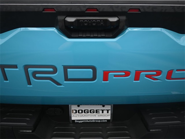 - "TRD PRO" hood badge; black door handles; black window molding and mirror caps; black technical-camo-grained tailgate spoiler and overfenders with marker lights