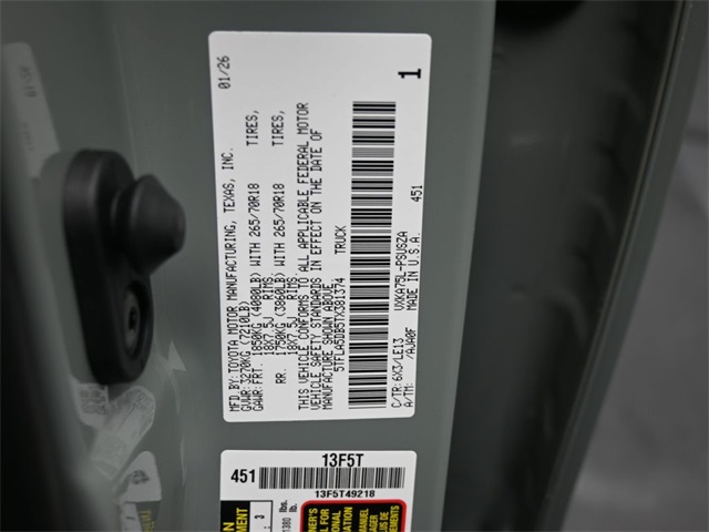Lunar 2026 Toyota Tundra SR5 4WD 10-Speed Automatic 3.4L V6 Doggett Toyota of Beaumont is proud to present you with another True Market Priced Pre-Owned Vehicle. This 2026 Toyota Tundra SR5 is loaded with the following Factory Options: SR5 Convenience Package (Blind Spot Monitor with Lane Change Assist and Parking Support Alert/Brake), TRD Off-Road Premium Package (8-Way Power-Adjustable Heated Front Seats, Automatic Power Tailgate with Easy Closing, Front and Rear Mud Guards, and Leather Seat Trim), 18" Alloy Wheels, 3.31 Axle Ratio, 4-Way Manual Front Seats, 4-Wheel Disc Brakes, 9 Speakers, ABS brakes, Air Conditioning, Alloy wheels, AM/FM radio: SiriusXM, Apple CarPlay/Android Auto, Auto High-beam Headlights, Automatic temperature control, Bed Step, Blind Spot Monitor, Brake assist, Bumpers: body-color, Delay-off headlights, Driver door bin, Driver vanity mirror, Dual front impact airbags, Dual front side impact airbags, Electronic Stability Control, Emergency communication system: Safety Connect (up to 10-year trial subscription), Exterior Parking Camera Rear, Fabric Seat Trim (FB), Front anti-roll bar, Front Bucket Seats, Front Center Armrest, Front fog lights, Front reading lights, Front wheel independent suspension, Fully automatic headlights, Heated door mirrors, Illuminated entry, Knee airbag, Leather Steering Wheel, Low tire pressure warning, Occupant sensing airbag, Outside temperature display, Overhead airbag, Overhead console, Panic alarm, Passenger door bin, Passenger vanity mirror, Power door mirrors, Power driver seat, Power steering, Power windows, Predator Drop Step, Radio data system, Radio: Audio Multimedia System, Radio: Audio Plus, Rear reading lights, Rear step bumper, Rear window defroster, Remote keyless entry, Safety Connect, Security system, Speed control, Speed-sensing steering, Split folding rear seat, SR5 Painted Mirror, Steering wheel mounted audio controls, Tachometer, Telescoping steering wheel, Tilt steering wheel, Traction control, Trip computer, Variably intermittent wipers, Voltmeter, and Wheels: TRD 18" Off Road!!
